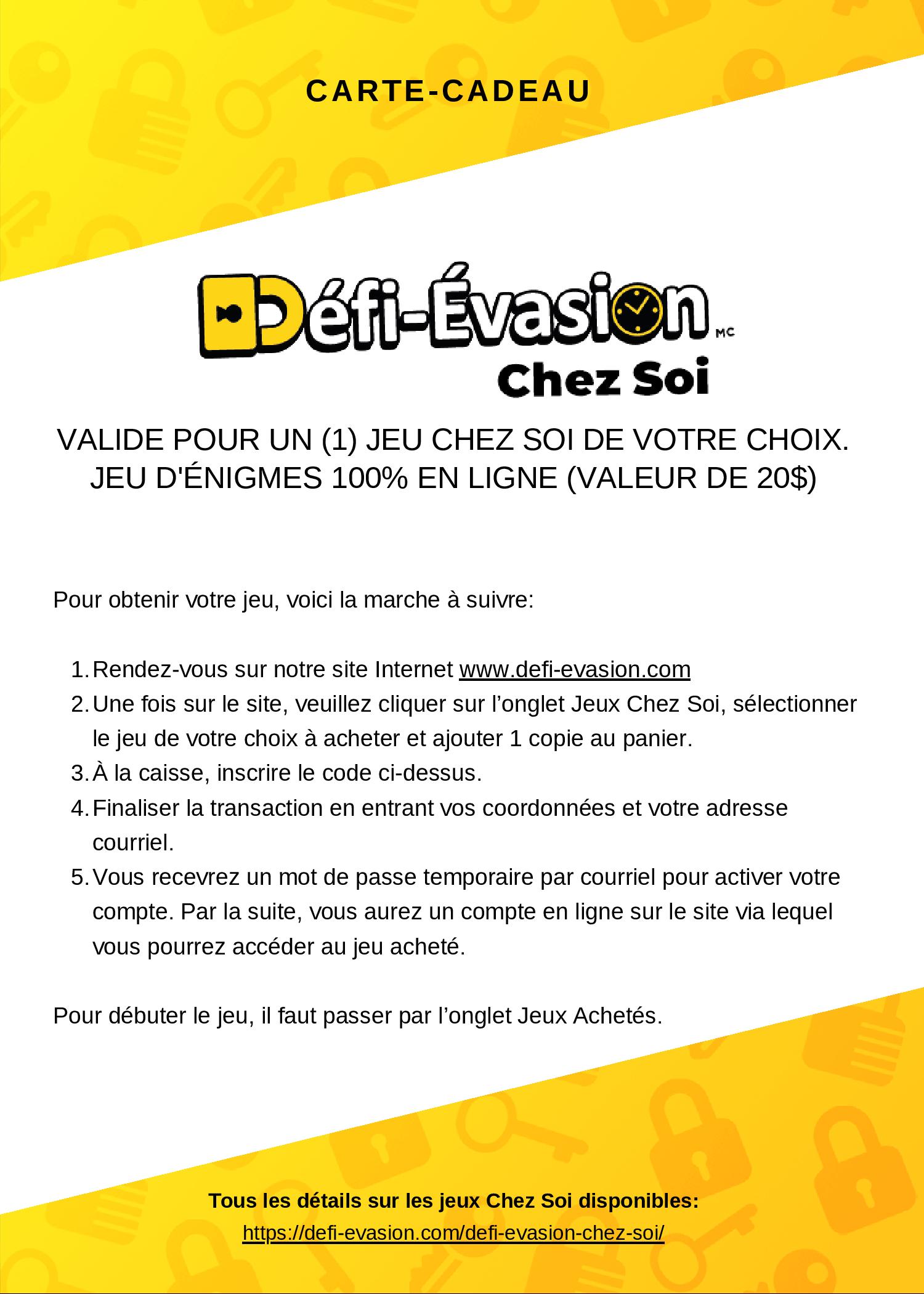 Cette carte-cadeau est valide pour n’importe lequel de nos jeux Chez Soi.